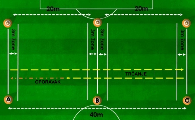 Ponavljajući se trči dionica 40 metara, prekidan svakih 30 sekundi fazom odmora od 15 sekundi. Brzina se povećava za 0,5 km/h nakon svake pauze.